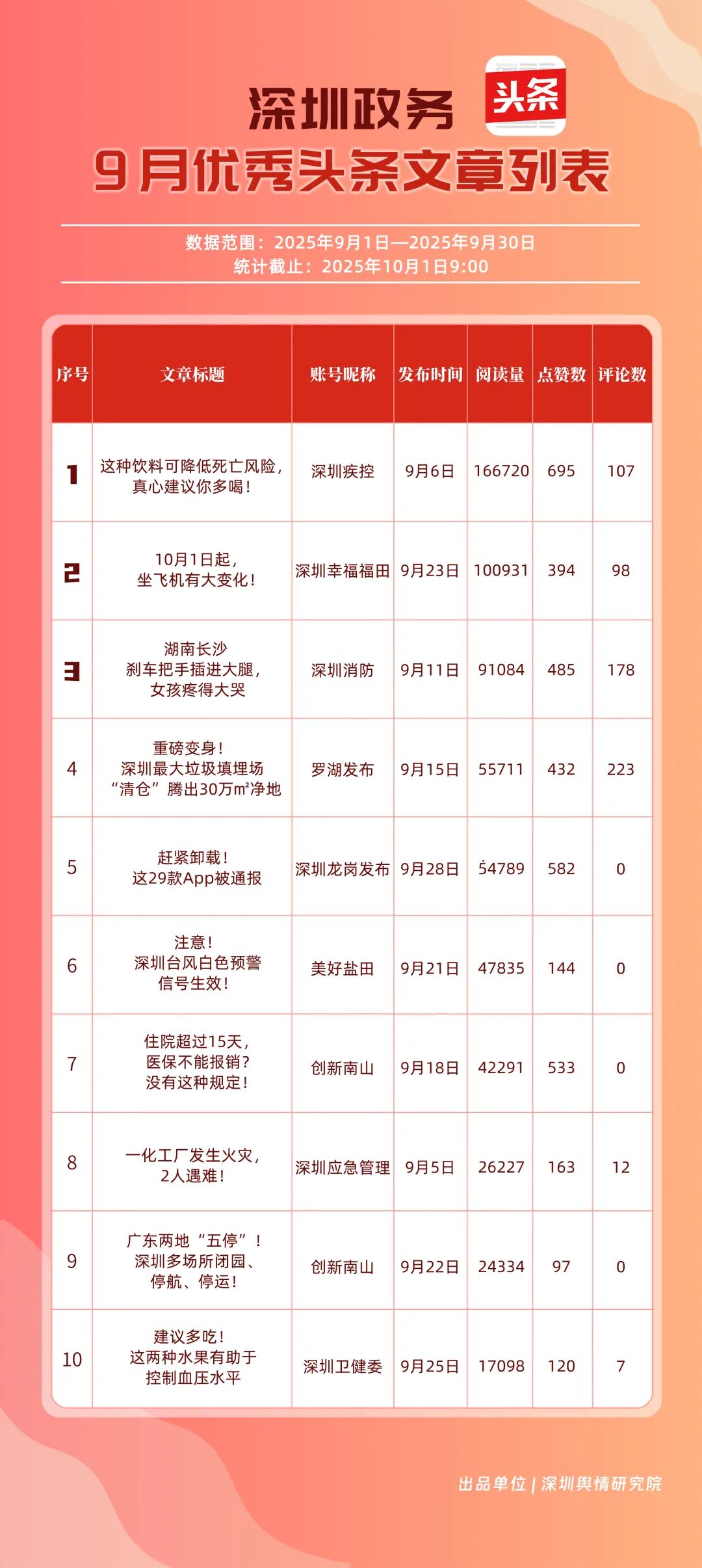 9月,“深圳幸福福田”“深圳疾控”“深圳消防”“羅湖發(fā)布”“深圳龍崗發(fā)布”“創(chuàng)新南山”“深圳龍華”“青春深圳”“深圳人社”“濱海寶安”共10個政務頭條號入選“優(yōu)秀政務頭條號”榜單?!吧钲谛腋8L铩狈€(wěn)居榜單首位,在傳播、互動等方面均表現(xiàn)卓越;“深圳疾控”關注民生健康,有關“喝茶的好處”“非正規(guī)醫(yī)美針風險”兩篇文章閱讀均超10萬次,為市民提供健康信息;“深圳消防”聚焦消防安全領域,提醒市民注意安全。相關上榜賬號表現(xiàn)優(yōu)異,注重內(nèi)容實用化、互動場景化,彰顯了政務新媒體的服務效能。