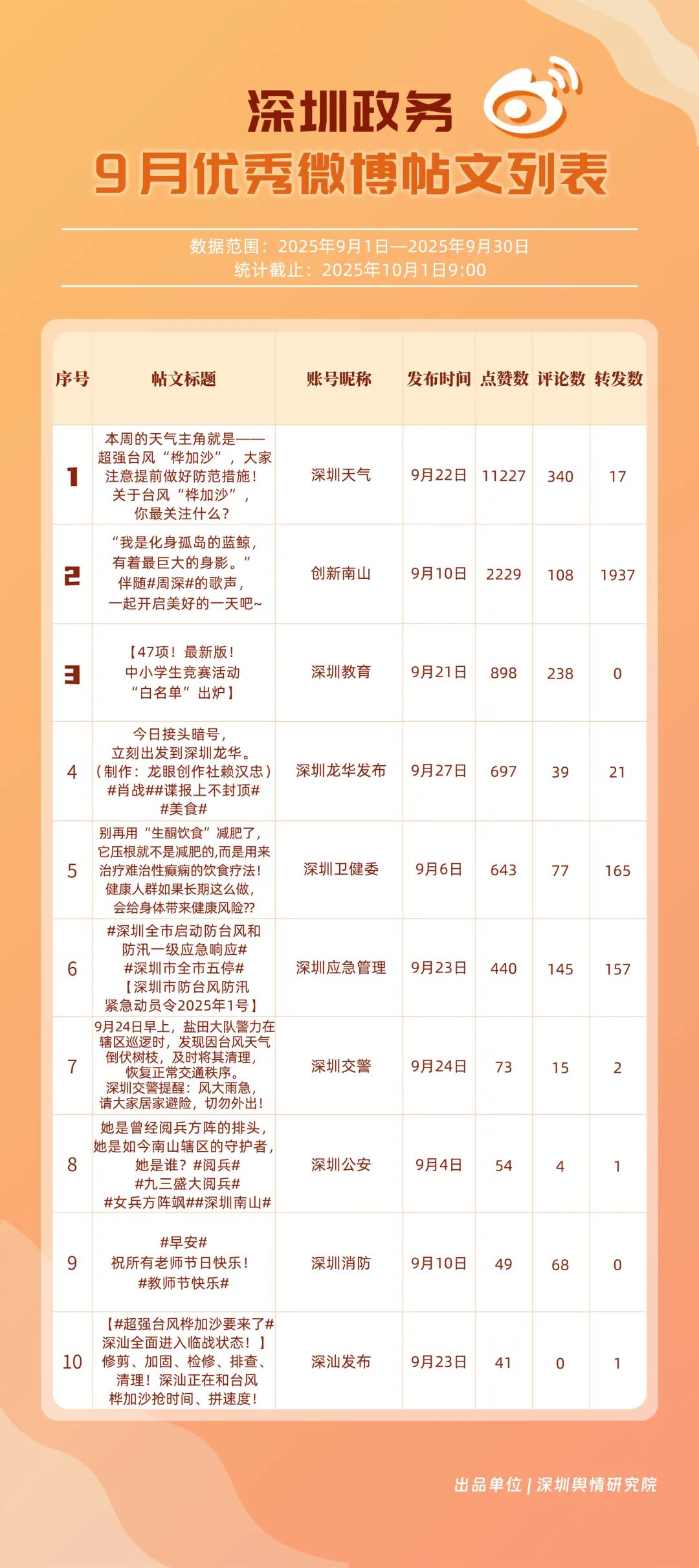 9月,20個賬號入選“優(yōu)秀政務微博號”榜單,其中包括:“深圳天氣”“創(chuàng)新南山”“深圳龍崗發(fā)布”“深圳衛(wèi)健委”“深圳消防”“深圳應急管理”“福田發(fā)布”“深圳公安”“深圳交警”“深圳教育”等。其中,“深圳天氣”蟬聯(lián)榜首,尤其9月出現(xiàn)臺風天氣,賬號受關注度再提升;“創(chuàng)新南山”賬號以多維度內(nèi)容策略實現(xiàn)傳播效能提升,其內(nèi)容中與歌手周深的聯(lián)動也成為一大亮點,獲得了較好傳播效果,以94.34分排名榜單第二;“深圳龍崗發(fā)布”“深圳衛(wèi)健委”兩賬號得分均在93分以上,在區(qū)域宣傳、內(nèi)容科普方向發(fā)力。上榜優(yōu)秀微博賬號展現(xiàn)出較高的內(nèi)容創(chuàng)新能力,以年輕化語態(tài)構建傳播體系,形成兼具專業(yè)性與傳播力的優(yōu)秀案例。