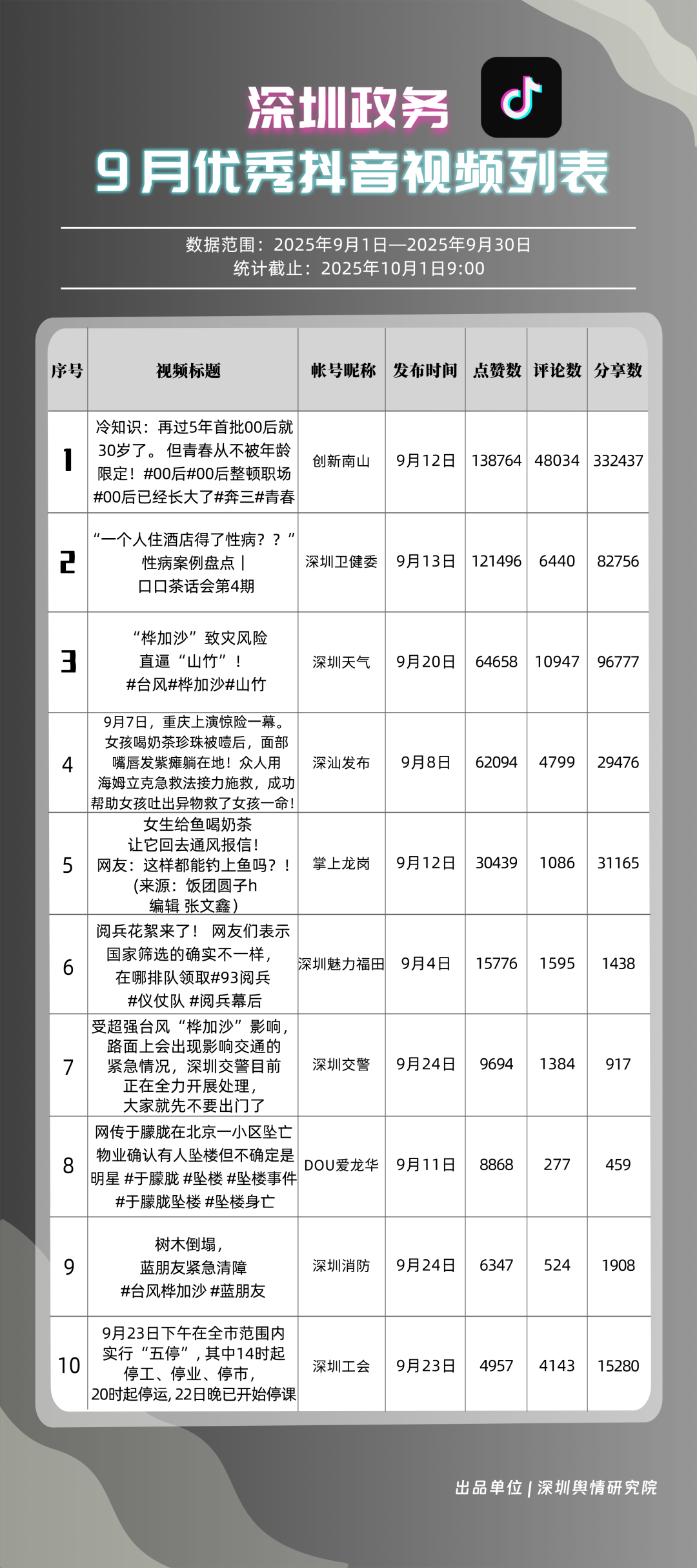 9月,獲得“優(yōu)秀政務抖音號”稱號的是“創(chuàng)新南山”“深圳天氣”“深圳衛(wèi)健委”“深圳魅力福田”“深汕發(fā)布”“掌上龍崗”“DOU愛龍華”“深圳工會”“青春深圳”“深圳交警”?!皠?chuàng)新南山”以一條有關“青春不被年齡限定”的視頻獲得超34萬次轉(zhuǎn)發(fā),超14萬次點贊,助力其在抖音榜單居于榜首;“深圳天氣”多條臺風相關視頻吸引大量網(wǎng)民關注、互動,在抖音平臺得分超98分;“深圳衛(wèi)健委”“深圳魅力福田”“深汕發(fā)布”等賬號緊隨其后,得分均在92分以上。上榜的優(yōu)秀政務抖音號以“有溫度”的敘事表達,將宣傳、服務內(nèi)容轉(zhuǎn)化為網(wǎng)民喜聞樂見的視頻,收獲高點贊、高轉(zhuǎn)發(fā)的流量實績,更在評論區(qū)形成了良性互動生態(tài),深度運營收獲了較好成果。