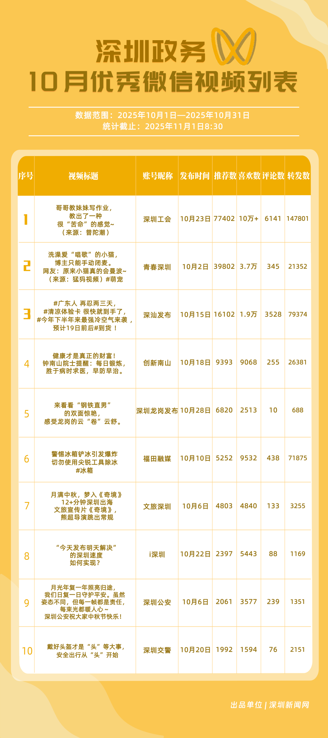 10月,“深圳工會”“深汕發(fā)布”“創(chuàng)新南山”“深圳龍崗發(fā)布”“青春深圳”“福田融媒”“深圳龍華”“濱海寶安”“深圳光明”“深圳天氣”上榜“優(yōu)秀政務(wù)微信視頻號”。其中,“深圳工會”一條有關(guān)教寫作業(yè)教出“命苦感”的視頻吸引大量網(wǎng)民關(guān)注,獲得超10萬次喜歡,助推其位列榜單第一名;“深汕發(fā)布”積極傳播降溫、臺風(fēng)等民生信息,以99.91分位列榜單第二名;“創(chuàng)新南山”和“深圳龍崗發(fā)布”得分在95分左右,內(nèi)容突出區(qū)域成績與創(chuàng)新活力,實現(xiàn)了政務(wù)服務(wù)與傳播效果的雙贏。上榜賬號不斷強(qiáng)化區(qū)域動態(tài)與民生服務(wù)的傳播,在政務(wù)新媒體賽道形成示范效應(yīng)。