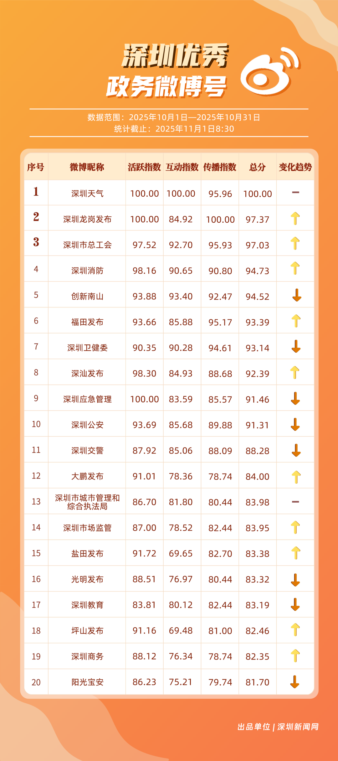 10月,20個賬號入選“優(yōu)秀政務(wù)微博號”榜單,其中包括:“深圳天氣”“深圳龍崗發(fā)布”“深圳市總工會”“深圳消防”“創(chuàng)新南山”“福田發(fā)布”“深圳衛(wèi)健委”“深汕發(fā)布”“深圳應(yīng)急管理”“深圳公安”等。其中,“深圳天氣”高頻、及時地發(fā)布天氣相關(guān)內(nèi)容,其中多篇關(guān)于“冷空氣”“入秋”帖文收獲較好互動和傳播效果,以100分位列榜單首位;“深圳龍崗發(fā)布”總分97.37分,居于榜單第二,其有關(guān)演唱會定檔、卷尺哥等內(nèi)容的帖文獲得較好數(shù)據(jù);“深圳市總工會”關(guān)注職工日常生活,以97.03分居于榜單第三。“深圳消防”“創(chuàng)新南山”等微博賬號也通過各自的特色內(nèi)容,展現(xiàn)深圳城市治理、民生服務(wù)的溫度。