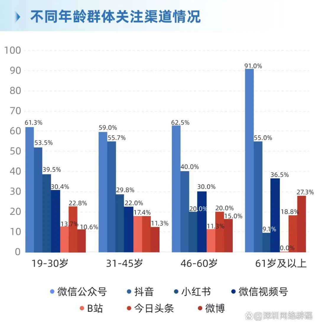 61歲及以上:微信公眾號占比91.0%,對抖音(55.0%)、微信視頻號(36.5%)依賴度也較高。