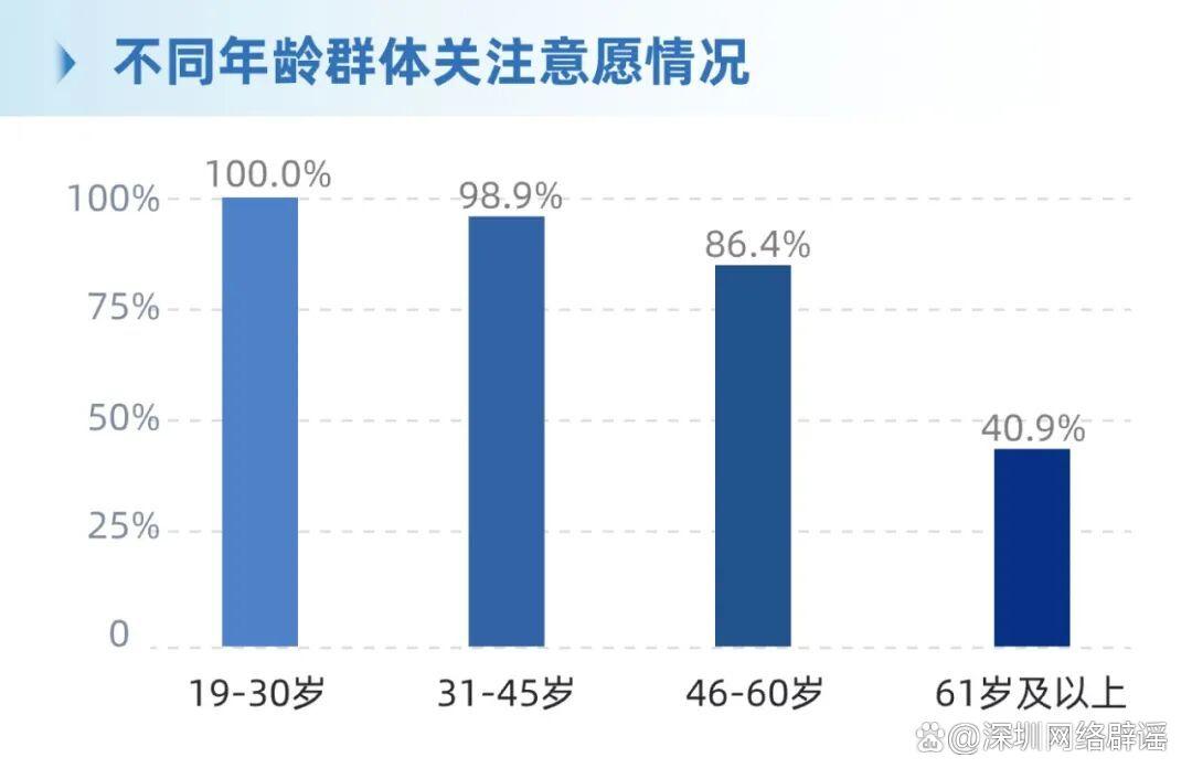 ·年齡差異:19-30歲關(guān)注意愿達100%,31-45歲為98.9%,46-60歲為86.4%,61歲及以上為40.9%。