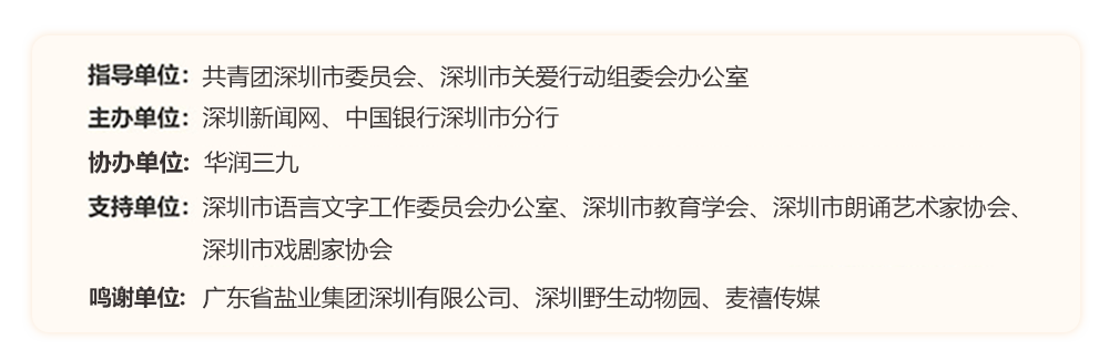 為助力建設良好的青少年閱讀環(huán)境,激發(fā)學生閱讀興趣,倡導親子閱讀,共建和諧家庭關系。2022年,“誰是故事大王·第六季”在共青團深圳市委員會、深圳市關愛行動組委會辦公室的指導下再出發(fā)?;顒佑缮钲谛侣劸W、中國銀行深圳市分行主辦,華潤三九協(xié)辦,得到了廣東省鹽業(yè)集團深圳有限公司、深圳野生動物園、麥禧傳媒的大力支持。更長的活動周期,更豐富的參與形式,更專業(yè)的賽制,等你來解鎖與挑戰(zhàn)!讓閱讀成為最動人的風景,讓故事的魅力感動深圳。說明:所有參賽者報名成功后,均承認并允許主辦方將個人參加本次活動的照片或視頻相關資料刊發(fā)在各類媒體雜志報紙上,用于活動宣傳。